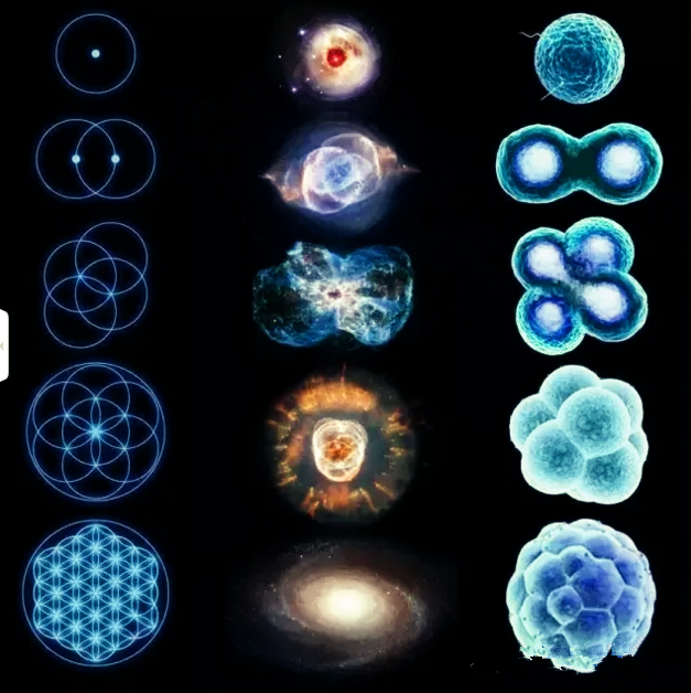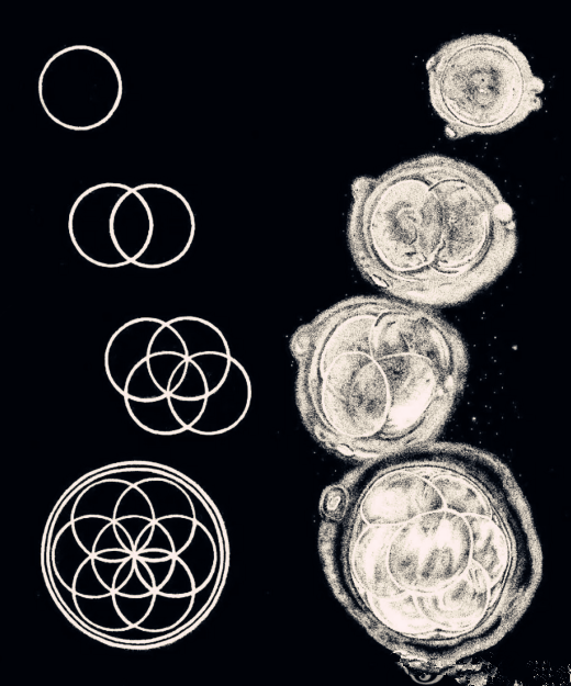 虽然生命之花图样在二维看起来是一连串的圆形,但其实是在表达三维空间球内有球的过程,因此图样很像人体细胞的减数分裂,也让生命之花成为自然创生过程的几何象征。